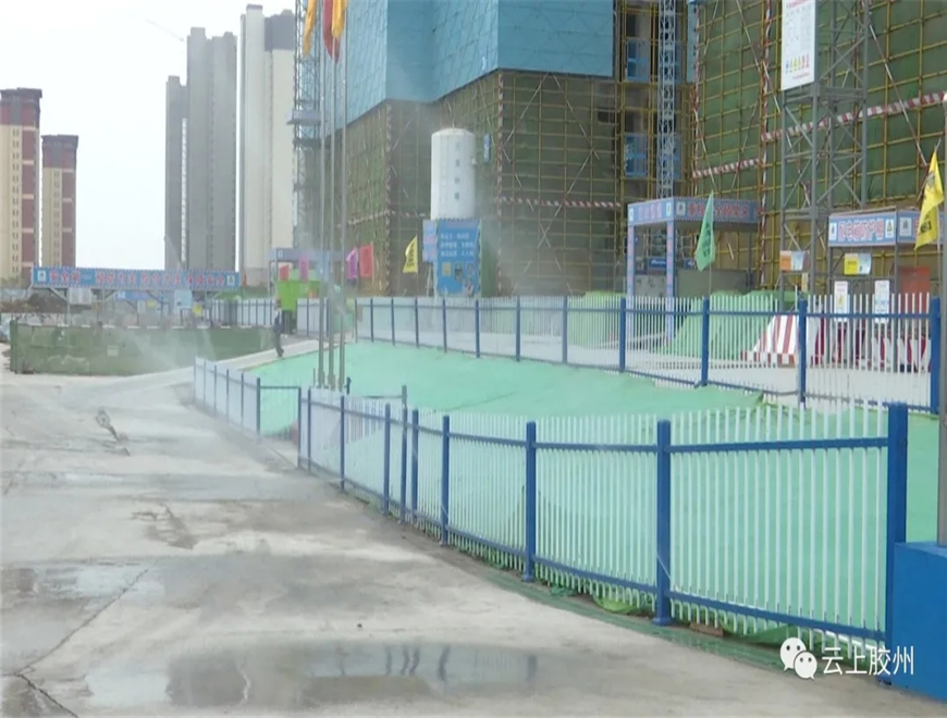 工地揚塵污染是工地標準化治理的一大難點。走進達能大廈工地,各種降塵設備齊發(fā)力,外部、內(nèi)部線性噴淋系統(tǒng)24小時開啟,大型霧炮機保證進出車輛噴水降塵。幾名保潔人員作為環(huán)境專管員每天對硬化路面進行沖洗,建筑工地沒有了人們印象中塵土飛揚的現(xiàn)象。
