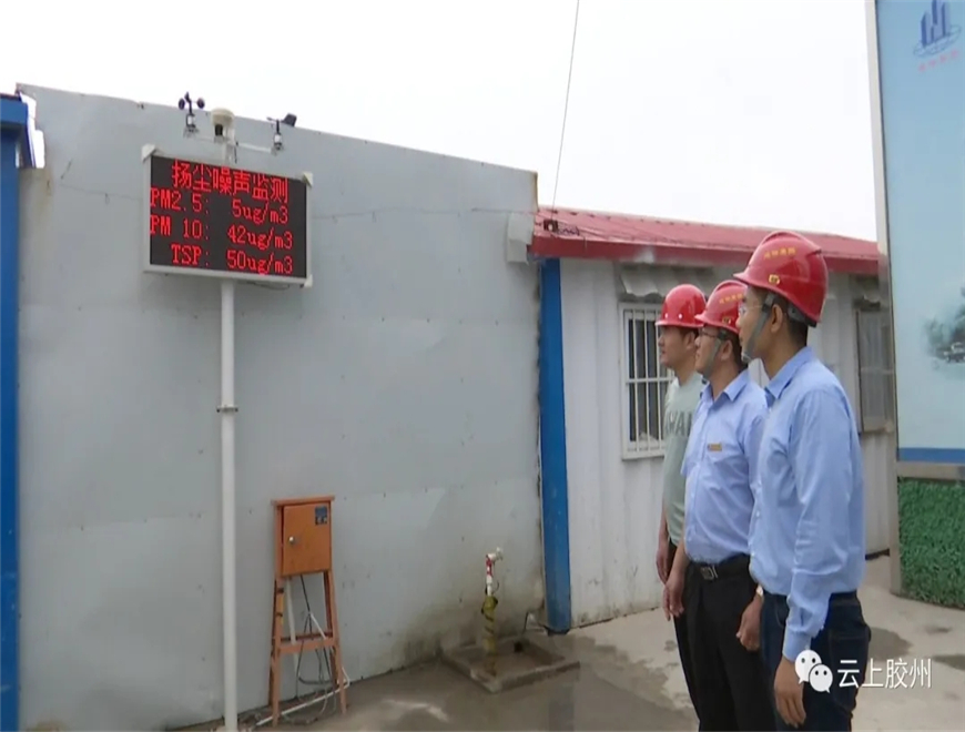 同時,在車輛進出的大門還配置了洗輪機和廢水沉淀池,現(xiàn)場的裸土區(qū)域全部用綠色密目網(wǎng)覆蓋。在工地大門一側,先進的監(jiān)測系統(tǒng)實時顯示PM2.5、噪聲、溫濕度等數(shù)值,噪聲比限值低了20個分貝,PM2.5可吸入顆粒物達到優(yōu)良標準,實現(xiàn)了“六個一百”全覆蓋。